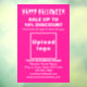Horreur, effrayant, effrayant, terrifiant, fantôme, monstre, crâne, citrouille et ainsi de suite. Joyeux Halloween ! Vacances pour faire peur, mais pas pour effrayer les clients. Vacances à célébrer en octobre et pour faire également la publicité de votre entreprise. Autocollant de fenêtre personnalisable avec Soldes Halloween, le nom de votre entreprise et d'autres informations. Autocollant de fenêtre que vous pouvez utiliser comme matériel marketing pour attirer plus de clients. Personnalisez-le et affichez-le pour convaincre davantage de clients d'acheter vos produits ou de faire appel à vos services. Les couleurs du design sont des textes blancs sur fond rose. Le contenu comprend un message de vœux Joyeux Halloween, des textes de soldes avec pourcentage de réduction que vous offrirez, dates de soldes, nom de votre entreprise, logo, adresse, numéro de téléphone, e-mail et site web ou page de médias sociaux de votre entreprise. Veuillez vérifier l'apparence après avoir téléchargé le logo et saisi les textes. Si l'apparence vous plaît, vous pouvez passer votre commande maintenant. Si vous devez redimensionner et déplacer le logo et les textes pour les adapter à cet autocollant de fenêtre ou à la taille et à la forme que vous choisirez, veuillez modifier dans l