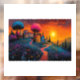 Cette oeuvre d'art vibrante et fantastique représente un village magique niché à flanc de colline sous un coucher de soleil à couper le souffle. Une pleine lune ou un soleil brillant, rayonnant de chaleur, domine le ciel orange et rouge vif, cloué d'étoiles scintillantes. Un chemin sinueux et rougeâtre serpente à travers une émeute de fleurs sauvages et d'herbes colorés dans les tons bleu, violet et rose. Des maisons de style traditionnel aux fenêtres éclatantes parsèment le paysage, menant à un ensemble de maisons à la crête. Des arbres aux couleurs éclatantes, dont un bleu électrique proéminent et une fuchsia vivante, ajoutent à l'atmosphère fantaisiste et surréaliste de cette scène onirique.