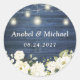 Autocollant de scellage d'enveloppe pour pot Mason en Bois Bleu Rustique Fleurs Blanches. Autocollant d'enveloppe de mariage avec guirlande de lumières et verdure en bois