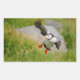 Un autocollant photo rectangulaire d'un oiseau-mouche de l'Atlantique volant avec des ailes étalées avant d'atterrir sur l'île de Runde, sur la côte atlantique de la Norvège.