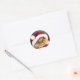 Joli autocollant de Noël représentant une photo d'un chat tigré mignon portant un chapeau et un costume de Père Noël rouge et blanc.