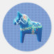 L'image arrière - plan du Blue Dala Horse Classic Round Sticker sur cet autocollant provient d'un tableau de Julia Morrill et l'image principale est d'un cheval en bois conçu, sculpté et peint par Julia Morrill