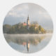 Autocollant photo rond d'un lever de soleil brumeux au lac Bled avec l'île avec l'église et brouillard avec réflexion dans l'eau à la première lumière du soleil du matin en Slovénie.