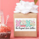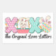 Cette image adorable présente le mot "XOXO" avec chaque lettre décorée de manière unique. Le premier "X" est rose avec des fleurs blanches, le "O" est un adorable lapin assis dans un panier rose à pois, le deuxième "X" a un motif à chevrons vert et blanc, et le "O" final est un motif diamant coloré avec des oreilles de lapin. De petits carottes et fleurs ornent les lettres, ajoutant une touche ludique. Sous les lettres, la phrase "The Original Love Letters" est écrite dans un script élégant. Ce design charmant est parfait pour ajouter une touche d'amour et de fantaisie à tout sceau d'enveloppe ou autocollant.
