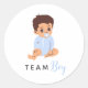 Ces autocollants ronds adorables représentent un bébé garçon dans un body bleu avec une tétine et le texte "Team Boy". Une façon amusante et élégante de décorer les faveurs, les enveloppes ou la décoration de fête lors de votre révélation de sexe.