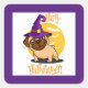 Une image mignonne d'un pug portant un chapeau de sorcière est présentée sur cet autocollant carré d'Halloween. Avec le message "Joyeux Halloween", ces autocollants sont parfaits pour un envoi spécial, le scrapbooking, la décoration et plus encore !