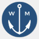 Autocollants d'ancre nautique avec monogramme. Idée pour le thème maritime Anniversaire fête ou baby shower. Personnalisable avec des lettres initiales de nom élégantes. Arrière - plan bleu marine avec ancre blanche symbole altimétrique.