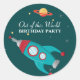 Ce mignon autocollant rond pour anniversaire de garçon a un thème hors du monde! L'arrière - plan a une couleur turquoise foncée avec beaucoup d'étoiles jaunes, blanches et grises dans l'arrière - plan. Il y a un vaisseau spatial volant de style rétro sur le fond avec une planète orange et rouge avec des anneaux sur le dessus. De cette fête d'anniversaire mondiale est écrit au milieu.