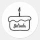 Stickers avec un design avec un dessin en ligne d'un gâteau d'anniversaire avec une bougie d'anniversaire. Le gâteau a une couche de glaçage et le gâteau de base où le nom du garçon/fille d'anniversaire est présenté, dans une police de script.