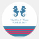 Stickers de Mariage de Cheval de mer élégant et classique avec une paire de hippocampes simples et une gamme de rayures en bleu marine foncé et rouge. Ces autocollants sur le thème de la plage nautique peuvent être facilement customisés avec vos détails mariages. Pour plus d'options de personnalisation, cliquez sur le bouton Customiser.