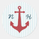 Autocollants de mariage nautique, coordonnez avec ma suite de mariage nautique. Design est une ancre rouge sur un arrière - plan rayé bleu et blanc, avec des lettres monogrammes. Parfait pour sceller vos invitations/enregistrer les dates/faveurs de fête.