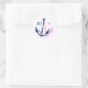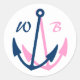 Autocollants de mariage nautique avec ancres monogrammées. Idée sympa pour le thème maritime / mariage de plage. Personnalisable avec nom lettres initiales de mariée et mariée. ancre marine bleu et rose sur arrière - plan blanc.