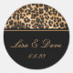 Autocollant mariage rond montré dans un empreinte de léopard noir et safari. Customisez cet autocollant avec vos noms et votre date.