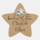 Une scène de plage charmante mettant en vedette un couple d'étoiles de mer créées à partir de pierres précieuses scintillantes—l'une ornée d'un voile, l'autre d'un nœud papillon. Le design comprend une typographie « Amour » sculptée dans le sable sur un fond sablonneux, personnalisée avec les noms du couple. Un souvenir doux ou un autocollant cadeau pour les mariages sur la plage. Affiché dans un design en forme d'étoile avec des formes supplémentaires disponibles.