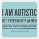 Texte en lettres majuscules gris foncé : "Je suis autiste / Pas une personne autiste / S'il vous plaît utiliser l'identité première langue." Sous cela se trouve le texte "réseau des femmes autistes".