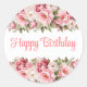 Un autocollant rond joyeux anniversaire est présenté avec une jolie impression florale de pivoine rose.