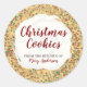 Autocollant pour biscuit saupoudré de Noël présentant un fond de biscuit sur le thème de Noël, avec des paillettes rouges, vertes et blanches et de la crème glacée blanche. Le produit comprend un modèle à personnaliser avec votre nom et message.