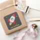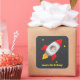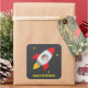 Autocollants décoratifs pour anniversaire sur le thème de l'espace avec une fusée rouge, blanche et grise décollant dans l'espace avec un garçon astronaute mignon qui agite la main depuis le cockpit ! Décoré d'étoiles et de points sur fond gris foncé. Ajoutez votre message dans le modèle de texte fourni.