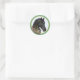 Autocollants de cheval noir. Les fleurs sauvages poussent près de la tête d'un beau cheval noir. Il a un tout petit peu de blanc sur le visage, mais tout le reste est noir. L'autocollant est bleu pâle avec une bordure verte ainsi qu'une fine ligne de jaune doré. Les autocollants ronds existent en deux tailles.