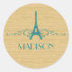 Stickers français élégant et chic avec un faux arrière - plan à grain de bois et un design Tour Eiffel en turquoise orné de cascades de tourbillons élégants. Ce design girly et tendance est facile à customiser avec le texte personnalisé de votre choix. Cliquez sur "Customiser" pour trouver d'autres options de personnalisation.