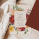 Notre invitation mariage de automne comprend des fleurs d'automne aquarelle disposées sur un arrière - plan d'ivoire et une arrière en terre cuite foncée, l'option idéale pour votre célébration de félicité saisonnière.