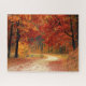 Une photo d'un chemin de terre tranquille serpentant au milieu de la magnifique forêt automnale orne ce puzzle.
