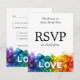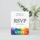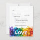 Il s'agit d'une belle carte RSVP verticale de la collection Mariage Painted With Love LGBTQ+. Il présente un design saisissant avec des coups de pinceau infusés d'arc-en-ciel en bas, créant une base vibrante pour le mot blanc et audacieux "LOVE". Le verso de la carte, conçu pour être entièrement personnalisable, dit clairement "Nous aimerions entendre de vous" et "RSVP" suivi de la date limite. L'avant de la carte est conçu pour que vos invités puissent répondre facilement. Il fournit une ligne pour qu'ils écrivent leur nom et des cases à cocher pour indiquer s'ils "accepteront avec plaisir" ou "regretteront de ne pas le faire". Un espace leur est également réservé pour indiquer le nombre de clients. Un élément clé de cette carte est l'option pour les clients de choisir leur choix de repas dans une liste personnalisable, comme "saumon grillé avec sauce au citron-aneth", "filet mignon avec réduction de vin rouge" et "poivrons farcis végétariens". De plus, une ligne séparée est mise à la disposition des clients pour vous informer de toute exigence alimentaire particulière, afin de garantir une expérience agréable et agréable pour tous. Cette carte allie à merveille design élégant et fonctionnalité pratique, rendant le processus RSVP simple et élégant.