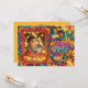 La carte de voeux Happy Diwali présente un cadre coloré et coloré, entouré de motifs floraux colorés. L'arrière - plan est un vert turquoise riche, qui contraste magnifiquement avec les teintes chaudes des fleurs. Les fleurs sont dans les tons orange, jaune, rouge et violet, créant une ambiance festive et animée. Le détail complexe comprend des vignes et des pétales tourbillonnants, ajoutant à l'élégance du design. L'espace vide au centre est encadré par une bordure dorée aux accents rouges, destinée à une image personnalisée. Le style général est inspiré par des motifs indiens traditionnels et est parfait pour une occasion festive comme Diwali.