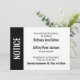 Voici une carte audacieuse et moderne pour avertir vos invités s'il est nécessaire de changer votre date de mariage. Utilisez les champs modèles pour ajouter vos détails personnels et faire de cette conception unique et simple votre propre. Un bloc de couleur le long de la gauche est noir, correspondant au texte et à l'arrière de la carte; "NOTICE" apparaît en gras blanc sur cette bande à gauche. Toutes les polices et couleurs sont également modifiables. Veuillez communiquer avec toute demande spéciale ou customiser de l'aide. D'autres pièces avec un autre libellé sont également disponibles dans la collection.