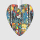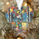 Un chat fantaisiste aux allures de vitraux géométriques se dresse dans une forêt de bouleaux très animée. L'arrière - plan présente un mélange coloré de feuilles d'automne et de tons bleus et jaunes. Photoshop Art numérique