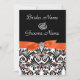 Faire-part de mariage damassé noir et blanc avec des accents orange et diamant.