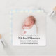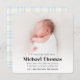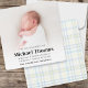 Ce design comprend un petit garçon simple minimaliste, avec un modèle photo bleu rayé, un bleu clair pastel plaid bleu, avec statistiques natales faire-part bébé, un modèle de mise en page de photo à fond saigné, un design minimaliste simple, un faire-part photo de petite fille mignonne, une police de typographie tendance design, un design simple de mise en page d'image de bébé, un faire-part garçon bleu clair simpliste
