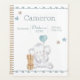 Ce planificateur de jour pour bébé personnalisé présente une jolie illustration de style aquarelle. Un petit éléphant de petit garçon est représenté au bas de la couverture avant, tenant un ballon en forme de coeur bleu. Une pile de blocs d'alphabet est placée devant lui. Un nom d'échantillon est imprimé en haut, suivi des détails de naissance du nouveau-né. La date, l'heure et le poids sont listés. Il est parfait pour stocker tous les dossiers de votre enfant et les rappels importants. Vous pouvez personnaliser le planificateur pour inclure votre propre nom personnalisé et d'autres textes.