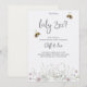 A baby gender reveal invitation card features delicate floral illustrations at the bottom with two bees buzzing above elegant script text. The back is a plain, light textured design. The tone is inviting and whimsical.