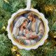 Cette carte de Noël aux bords de pétoncles ronds présente une scène de nativité entourée d'une fausse bordure d'or. Le dos a une salutation qui dit "QUE LE MIRACLE DE NOËL REMPLIT VOTRE COEUR DE MERVEILLE ET DE JOIE." Vous pouvez personnaliser avec votre ou vos nom(s) de famille et modifier l'accueil si vous le préférez.