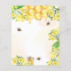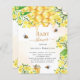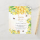 Un élégant arrière - plan blanc et doré à l'eau. Décoré d'abeilles bourdonnantes, de miel fondu et de nid d'abeille aux fleurs jaunes, de fleurs et d'un pot de miel. Avec le texte : Baby shower écrit avec un script de style à la main moderne. Personnalisez et ajoutez le nom de la mère à être. Lettres dorées et noires. Non sexiste.