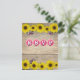 Bois rustique et patiné avec tête de tournesol jaune en haut et en bas avec accents de papillon rose. Typographie "RSVP" du casquette de bouteille rose et blanc. Modèle créé pour la date RSVP au dos. #rustique, #tournesols, #bouteilles, #vie à la campagne