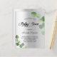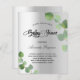 Une invitation baby shower moderne et élégante, neutre pour les femmes. Faux argent métallique d'aspect arrière - plan décoré de végétation eucalyptus, sprigs. Personnalisez et ajoutez un nom et des détails du parti. Lettres de couleur noire.