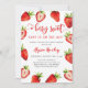 Carte d'invitation baby shower fille mignonne avec l'aquarelle illustration de fraises. Le texte dit "un bébé doux aux baies est en route."