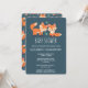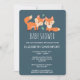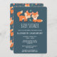 Baby shower invitation avec une illustration graphique de 2 renards oranges à l'air mignon et heureux. Arrière - plan vert foncé.