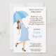 Une invitation facile à customiser, chic et mod style baby shower pour la future maman. Cette mignonne invitation au baby shower présente un adorable graphisme montrant une femme branchée branchée et branchée avec une grosse bosse de bébé de JWI Designs. Elle porte une jolie robe de polkadot et tient un parapluie rayé bleu qui repose sur son ventre saillant, évidemment dans les derniers stades de la grossesse et qui devrait bientôt accoucher ! Coordonner la police stylisée en bleu et marron correspondant.