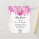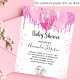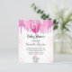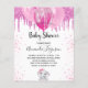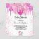 Pour un baby shower, célébrer une petite fille. Un arrière - plan blanc chic. Décoré avec des gouttes de parties scintillant rose, un look dégoulinant de peinture, des ballons et une mignonne petite fille d'éléphant. Personnalisez et ajoutez le nom de la mère à être le nom et les détails de la fête. Le nom et le texte : Baby shower sont écrits avec un script de style écrit à la main