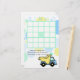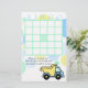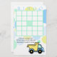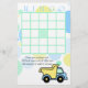 Baby shower carte de bingo pour compléter notre baby shower de camions de construction invitation avec des points confettis bleu, vert et jaune doux et camion à benne.