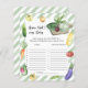 "Un bébé local est en route". Célébrez avec cette fête de baby shower à thème potager d'aquarelle ! Aquarelle concombre, oignon, aubergine, courgettes, tomates jaunes et rouges, radis, carottes, poivre chaud, poivre jaune doux, pois et chou, brocoli et betterave sur une planche à découper. Aquarelle de récolte biologique.
