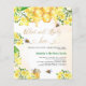 Un élégant arrière - plan blanc et doré à l'eau. Décoré d'abeilles bourdonnantes, de miel fondu et de nid d'abeille aux fleurs jaunes, de fleurs et d'un pot de miel. Avec le texte "What will baby bee" Personnalisez et ajoutez les noms des parents à abeilles. Texte doré, noir et vert. 1 feuille = 1 invite imprimé bord à bord.