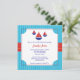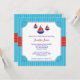 Cuisine, moderne et colorée invitation au baby shower. Cette invitation est idéale pour un baby shower à thème nautique. Il présente des voiliers à l'intérieur d'un cadre orné dans une palette rouge, bleu et blanc.