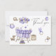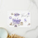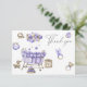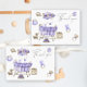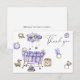 L'invitation montre l'aquarelle d'un berceau, d'une nourrice mobile sous forme de nuages ronds violets, des jouets pour enfants : un éléphant rongeur, un canard sur roues, un ours en peluche, un lapin, un bib, une sucette, une pyramide.