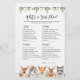 Baby shower à thème pour animaux de bois ce qui est dans votre carte de jeu de téléphone comprend une aquarelle des animaux de bois illustration et aquarelle de la végétation eucalyptus guirlande et élégante police de style manuscrit.