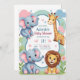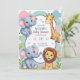 fêtez votre arrivée ! Bleu clair au centre, une girafe Sorro. Tous les animaux... L'arrière - plan est vert tendre avec des accents blancs et de petits coeurs roses et bleus, créant une ambiance animée et joyeuse. Cette invitation comprend des phrases comme "Vous êtes invité à" et "Invitation à une fête", ainsi que la lettre