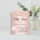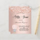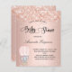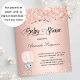 Pour un baby shower, célébrer une petite fille. Un arrière - plan blush, rose d'or faux métallique à l'air . Décoré avec de la poussière de parties scintillant, et une petite fille adorable d'éléphant dans une montgolfière. Personnalisez et ajoutez le nom de la mère à être le nom et les détails de la fête. Le nom et le texte : Baby shower sont écrits avec un script de style manuscrit 1 feuille = 1 invitation imprimé bord à bord